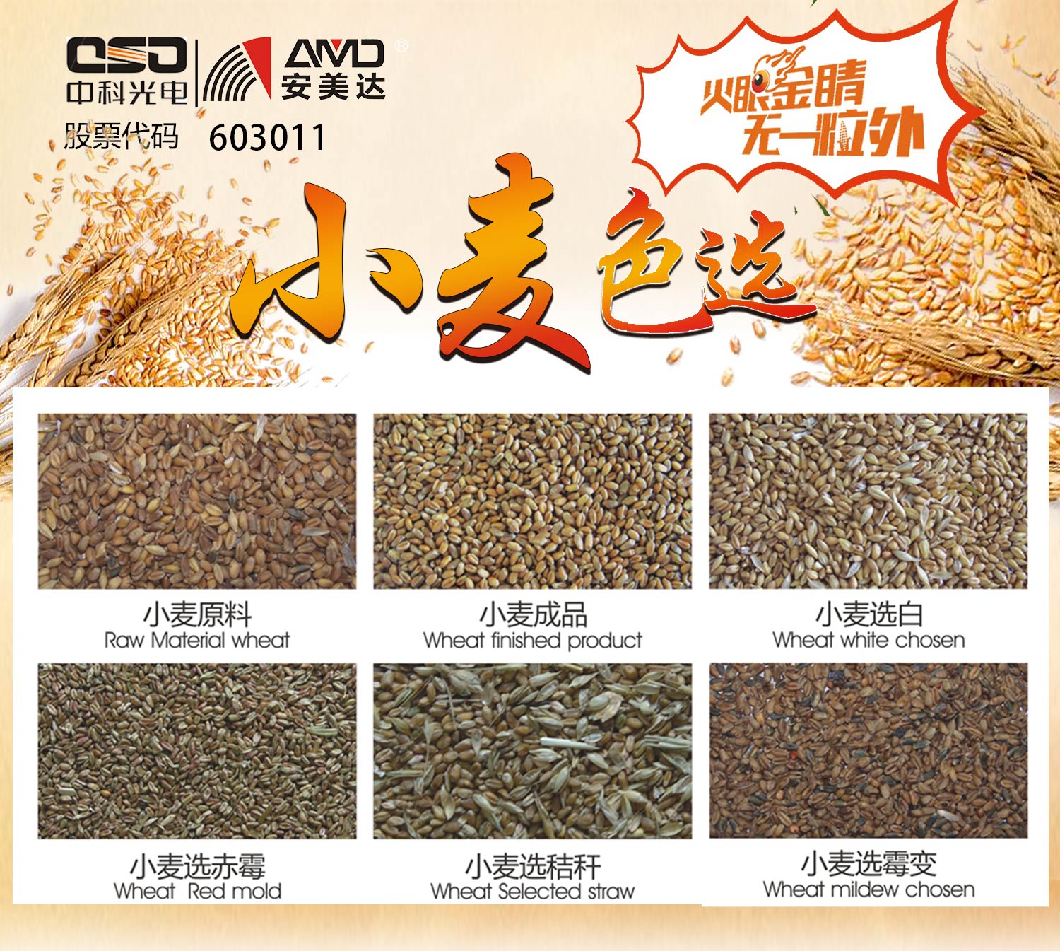 中科光电拥有多年的中储粮合作经验,针对小麦质量偏差、不符合入库标准,在小麦预处理工序中,安美达色选机拥有成熟的色选技术,精准剔除小麦赤霉病粒、不完善粒、杂质等,带出比低,精度高,创造最佳的产出效益。
